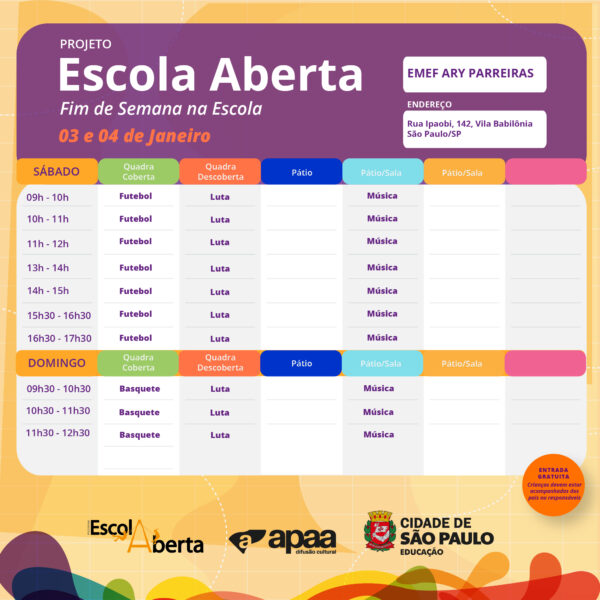 Confira a programação na EMEF – Ary Parreiras, para o próximo fim de semana.