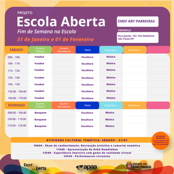 Confira a programação na EMEF – Ary Parreiras, para o próximo fim de semana.