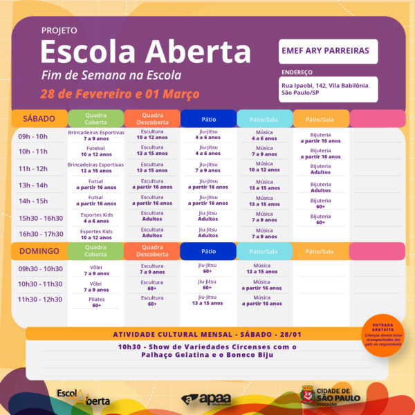 Confira a programação na EMEF – Ary Parreiras, para o próximo fim de semana.