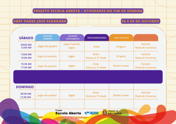 Confira a programação na EMEF – Jose Pegoraro Pe., para o próximo fim de semana.