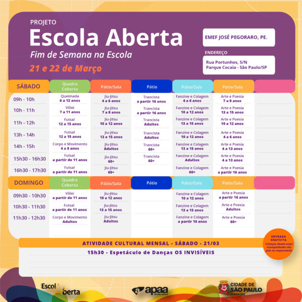 Confira a programação na EMEF – Jose Pegoraro, Pe., para o próximo fim de semana.