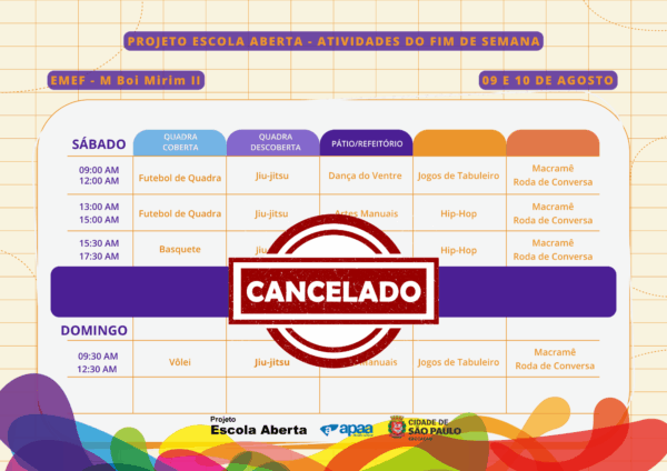 Comunicamos que as atividades deste final de semana, dias 9 e 10 de agosto de 2025 (sábado e domingo), na EMEF – M Boi Mirim II, estão SUSPENSAS para Manutenção da Unidade Escolar.