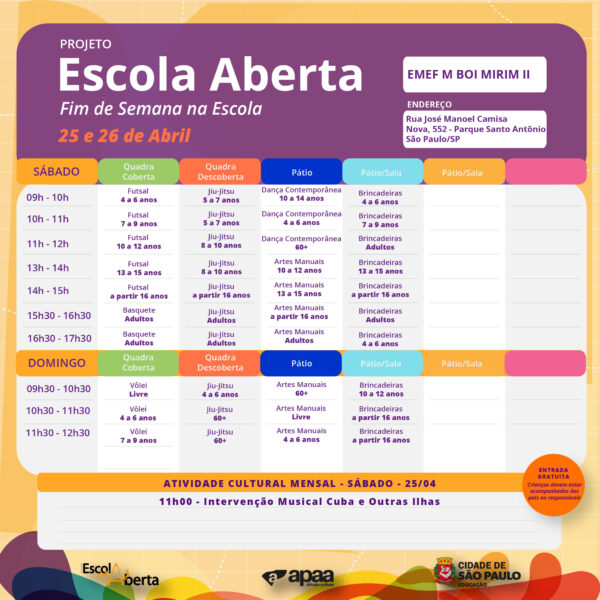 Confira a programação na EMEF – M Boi Mirim II, para o próximo fim de semana.