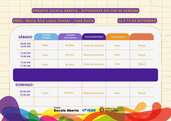 Confira a programação na EMEF – Maria Rita Lopes Pontes – Irmã Dulce, para o próximo fim de semana.