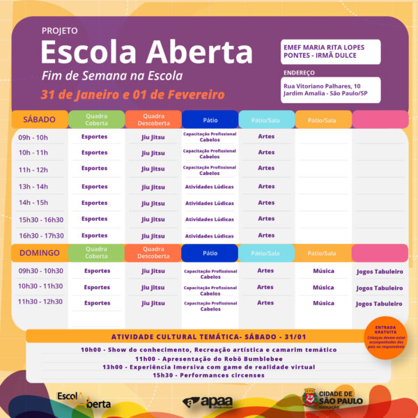 Confira a programação na EMEF – Maria Rita Lopes Pontes – Irmã Dulce, para o próximo fim de semana.