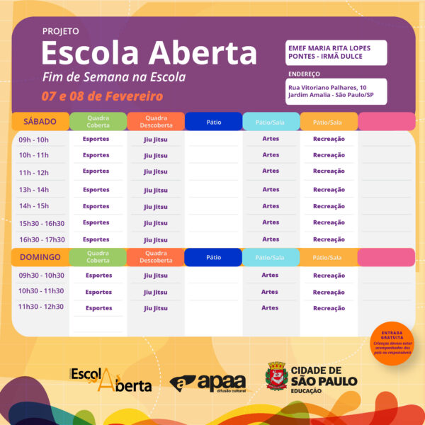 Confira a programação na EMEF – Maria Rita Lopes Pontes – Irmã Dulce, para o próximo fim de semana.