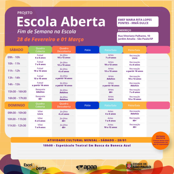 Confira a programação na EMEF – Maria Rita Lopes Pontes – Irmã Dulce, para o próximo fim de semana.