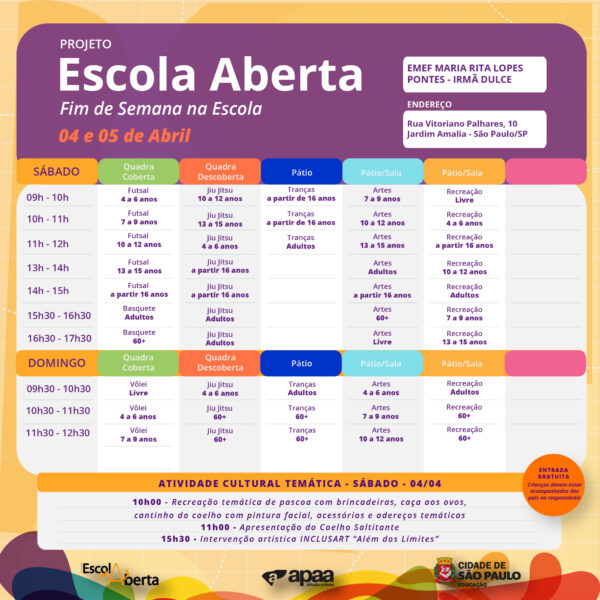 Confira a programação na EMEF – Maria Rita Lopes Pontes – Irmã Dulce, para o próximo fim de semana.