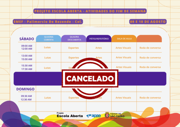 Comunicamos que as atividades deste final de semana, dias 9 e 10 de agosto de 2025 (sábado e domingo), na EMEF – Palimercio De Rezende – Cel., estão SUSPENSAS para Manutenção da Unidade Escolar.