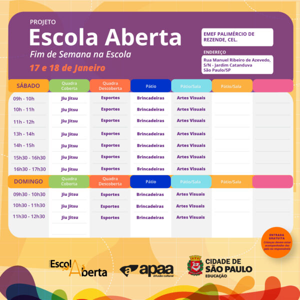 Confira a programação na EMEF – Palimercio De Rezende – Cel., para o próximo fim de semana.