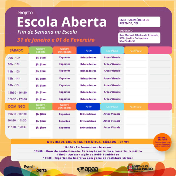 Confira a programação na EMEF – Palimercio De Rezende – Cel., para o próximo fim de semana.