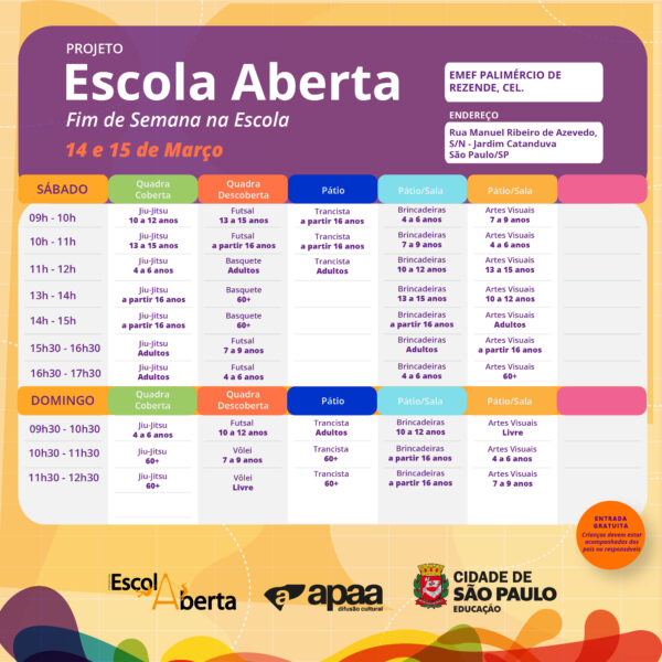 Confira a programação na EMEF – Palimercio De Rezende – Cel., para o próximo fim de semana.