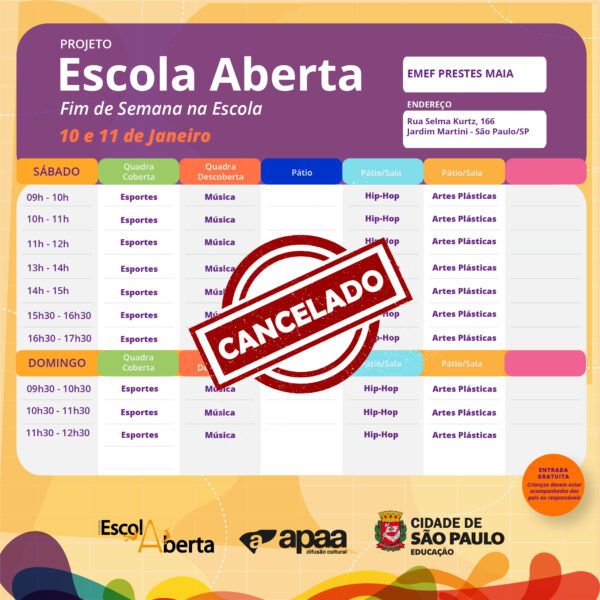 Por questão de força maior, informamos que as atividades da EMEF Prestes Maia, previstas para o próximo fim de semana (10 e 11 de janeiro) estão suspensas.