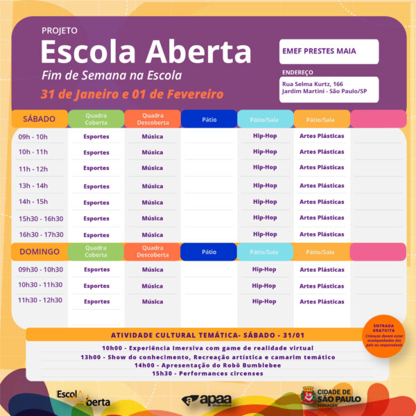 Confira a programação na EMEF – Prestes Maia, para o próximo fim de semana.