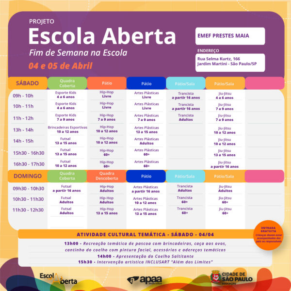 Confira a programação na EMEF – Prestes Maia, para o próximo fim de semana.