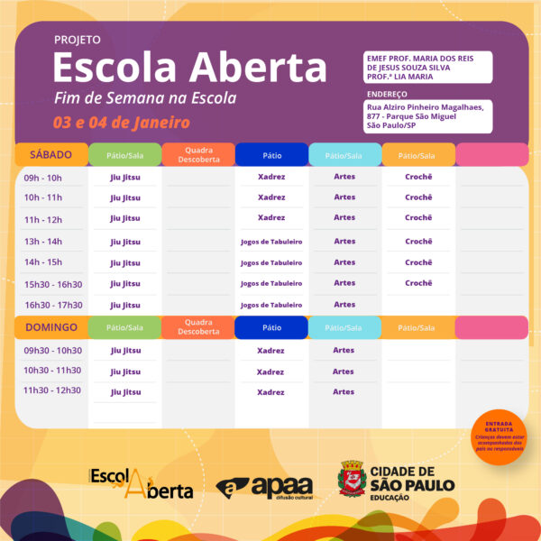 Confira a programação na EMEF Prof. Maria dos Reis de Jesus Souza (prof. Lia Maria), para o próximo fim de semana.