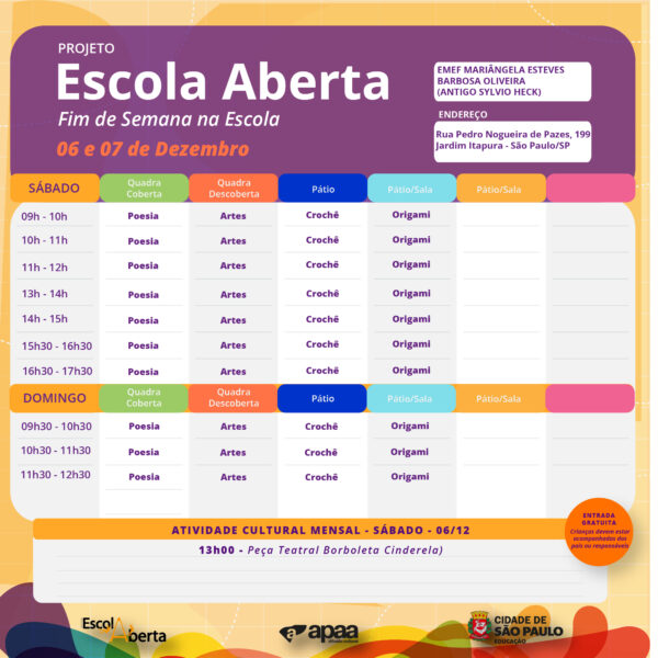 Confira a programação na EMEF Profª Mariangela Esteves (Antigo Sylvio Heck), para o próximo fim de semana.