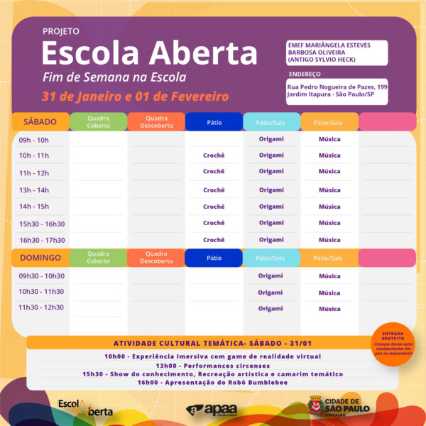 Confira a programação na EMEF Profª Mariangela Esteves (Antigo Sylvio Heck), para o próximo fim de semana.