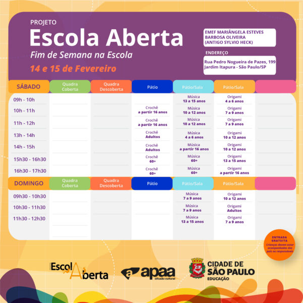 Confira a programação na EMEF Profª Mariangela Esteves (Antigo Sylvio Heck), para o próximo fim de semana.