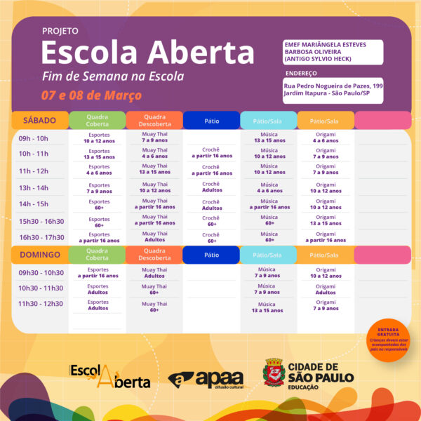 Confira a programação na EMEF Profª Mariangela Esteves (Antigo Sylvio Heck), para o próximo fim de semana.