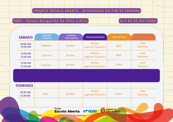 Confira a programação na EMEF – Teresa Margarida Da Silva e Orta, para o próximo fim de semana.