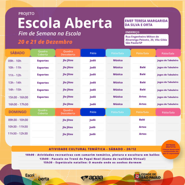 Confira a programação na EMEF – Teresa Margarida Da Silva e Orta, para o próximo fim de semana.