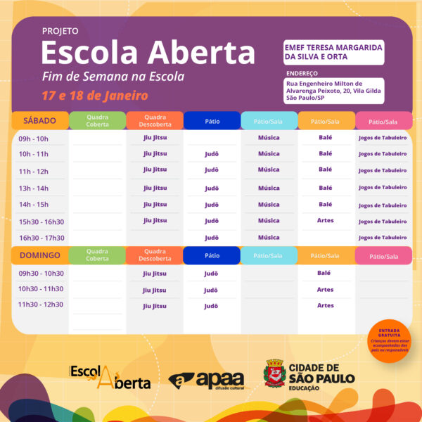 Confira a programação na EMEF – Teresa Margarida Da Silva e Orta, para o próximo fim de semana.