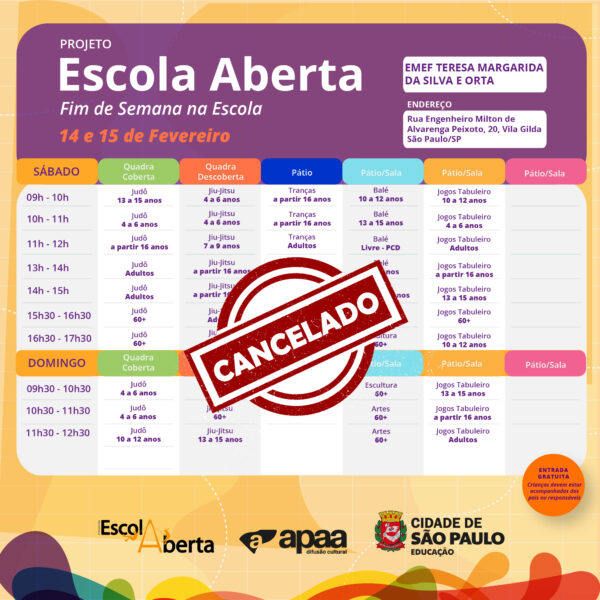 Informamos que não haverá atividade do Programa Escola Aberta nos dias 14 e 15 de Fevereiro na EMEF Teresa Margarida Da Silva e Orta.