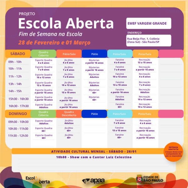 Confira a programação na EMEF – Vargem Grande, para o próximo fim de semana.