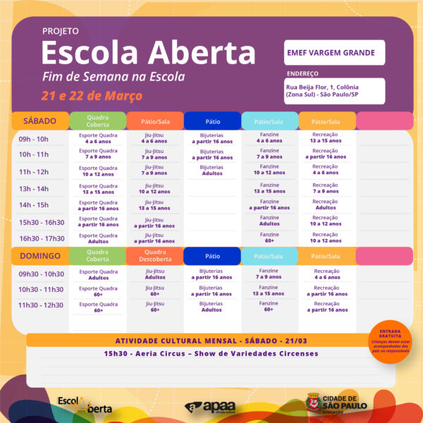Confira a programação na EMEF – Vargem Grande, para o próximo fim de semana.