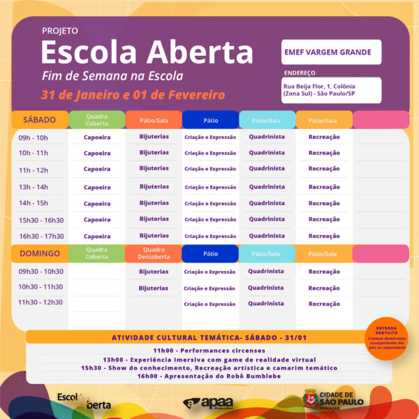 Confira a programação na EMEF – Vargem Grande, para o próximo fim de semana.