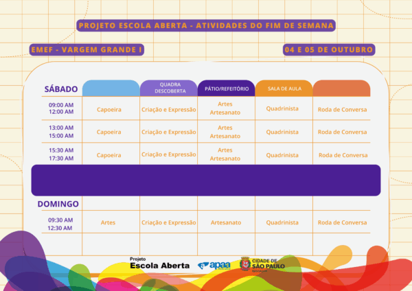 Confira a programação na EMEF – Vargem Grande I, para o próximo fim de semana.