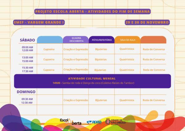 Confira a programação na EMEF – Vargem Grande I, para o próximo fim de semana.